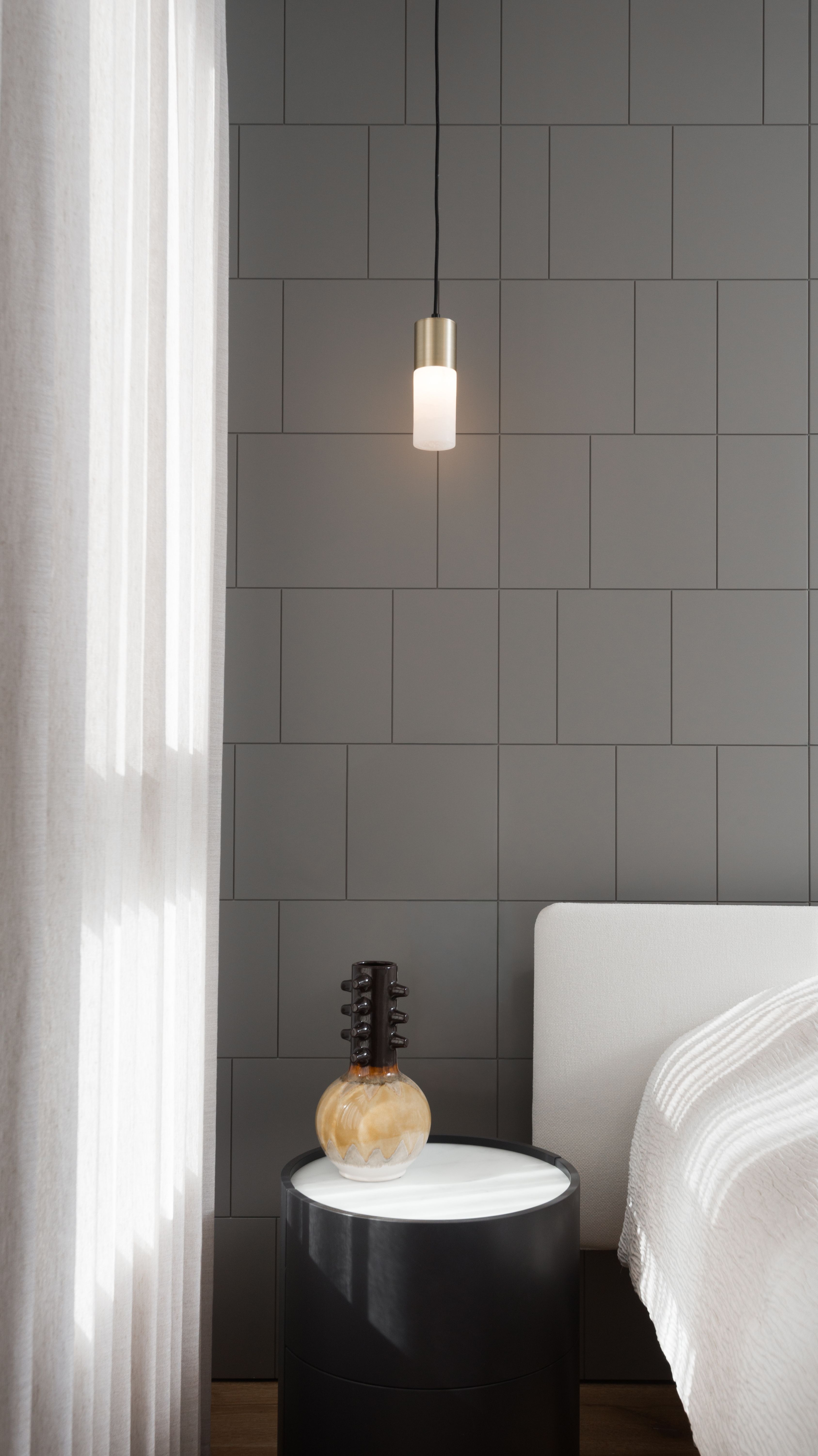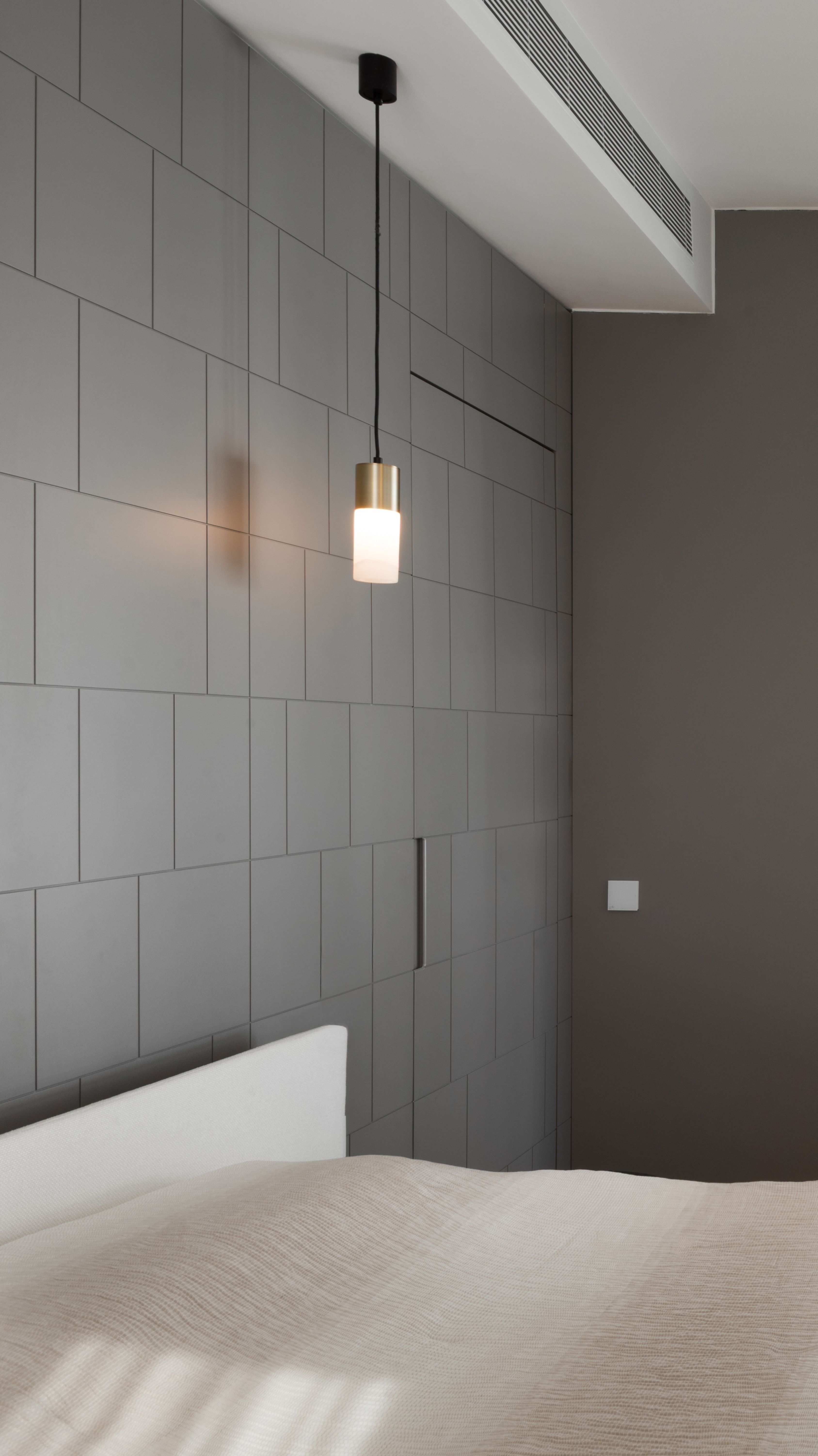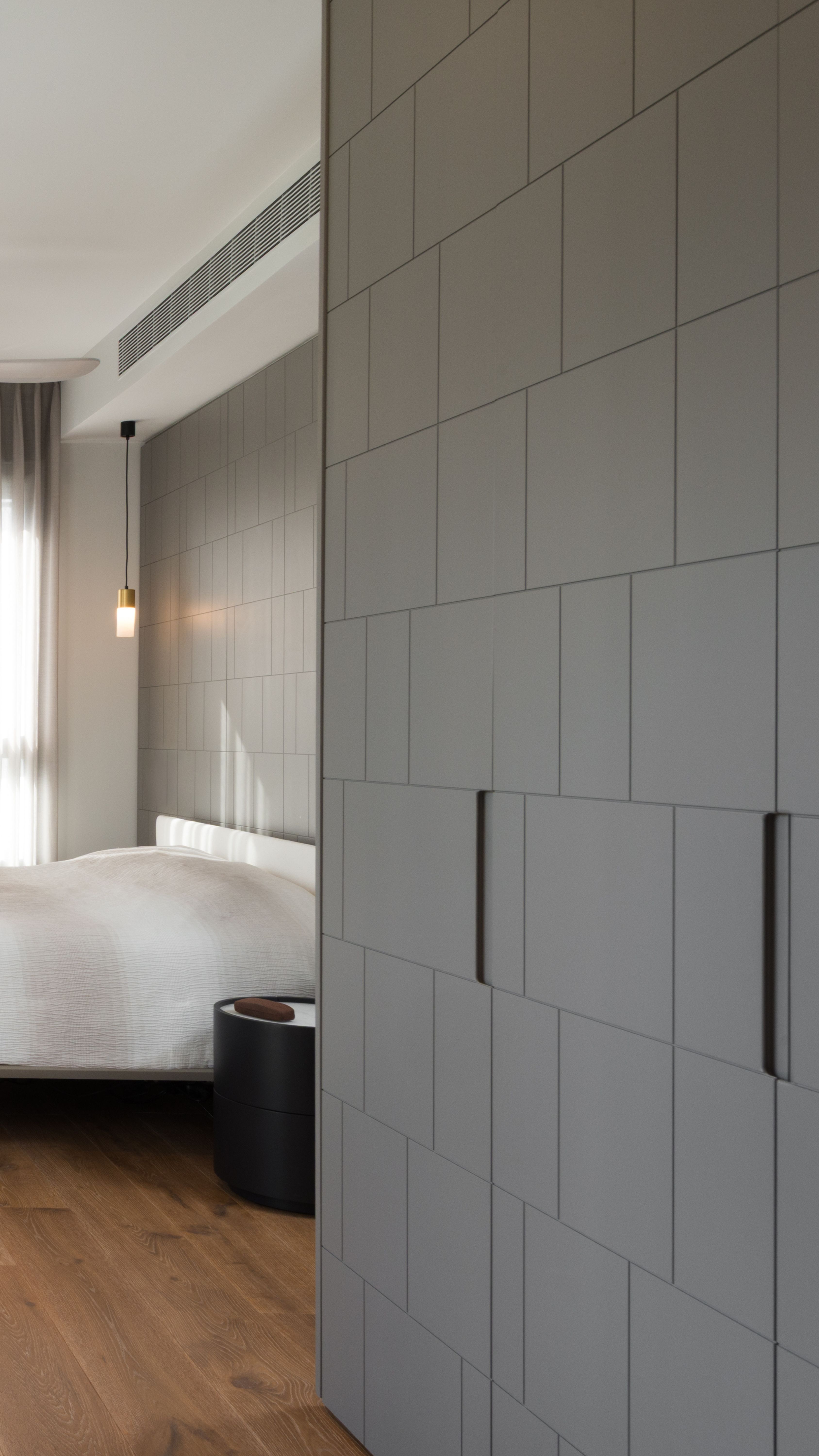 אחד המהלכים המשמעותיים בפרויקט הוא השימוש בחיפויי קיר כבסיס לשפה אדריכלית שלמה. חיפוי הקיר, בגוון אפור ובגמר צבע בתנור, תוכנן בטקסטורה גיאומטרית המייצרת משחק עדין של אור וצל. מעבר להיותו יפה, חיפוי הקיר מתפקד כמערכת שלמה: הוא מחבר בין חללים, מצניע מה שצריך, ומייצר המשכיות.