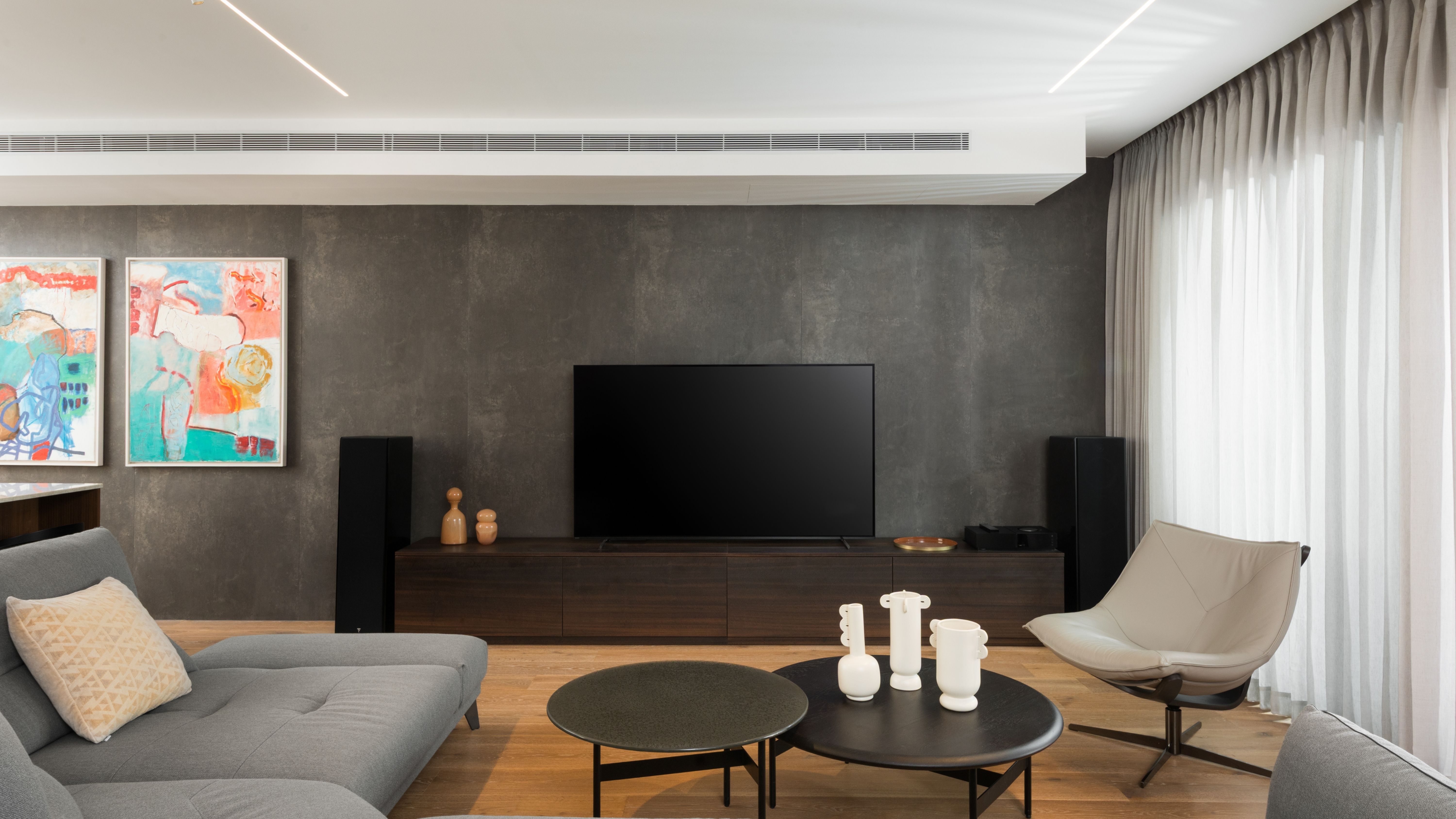 במרכז החלל הציבורי, קיר כוח דרמטי מגרניט פורצלן פוגש שידת טלוויזיה בנגרות בהתאמה אישית. השידה, עשויה פורניר אקליפטוס עשיר, אינה רק פריט פונקציונלי, היא אלמנט מאזֵן. היא מכניסה חמימות ויוצרת דיאלוג בין החומרים.