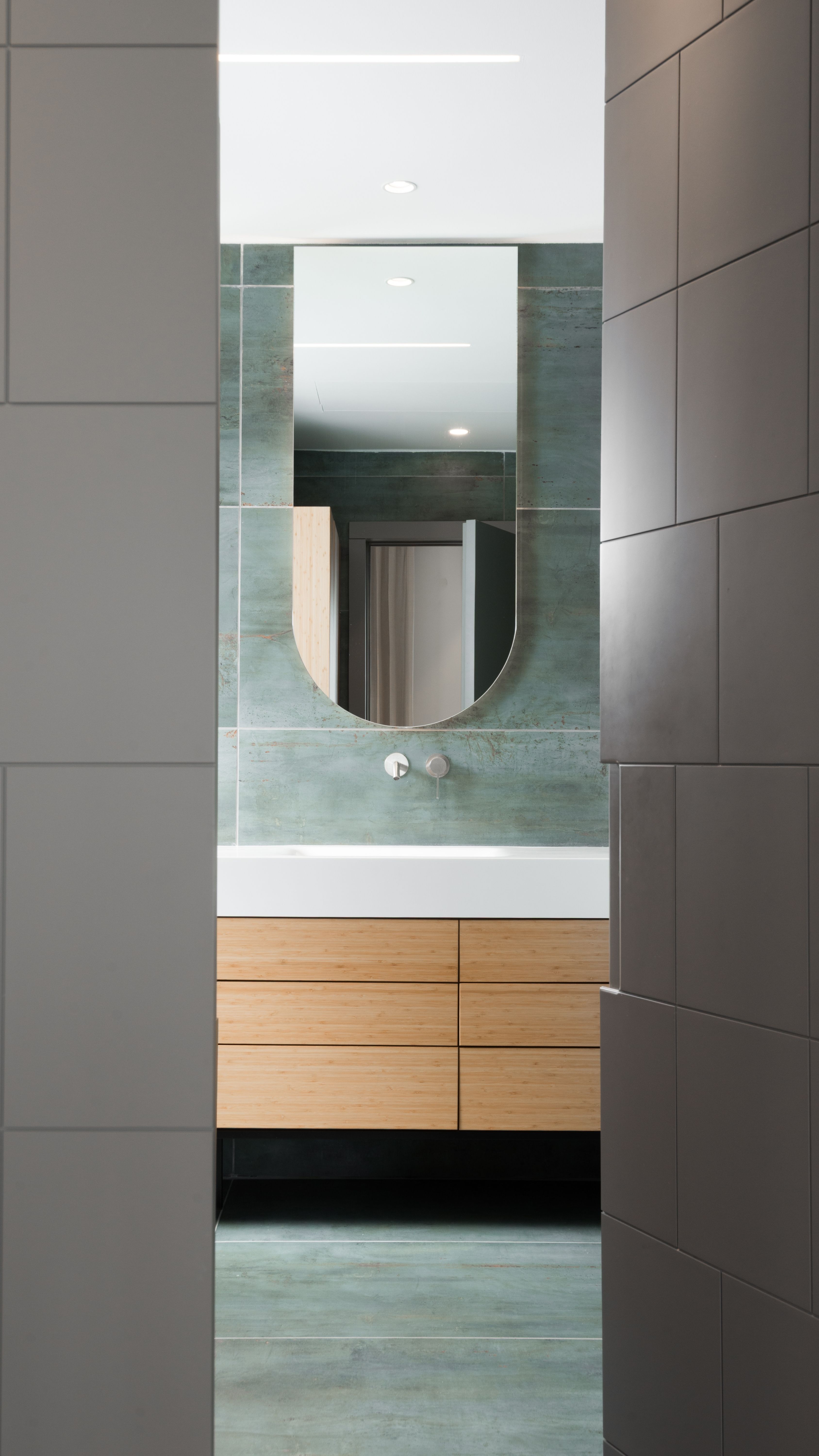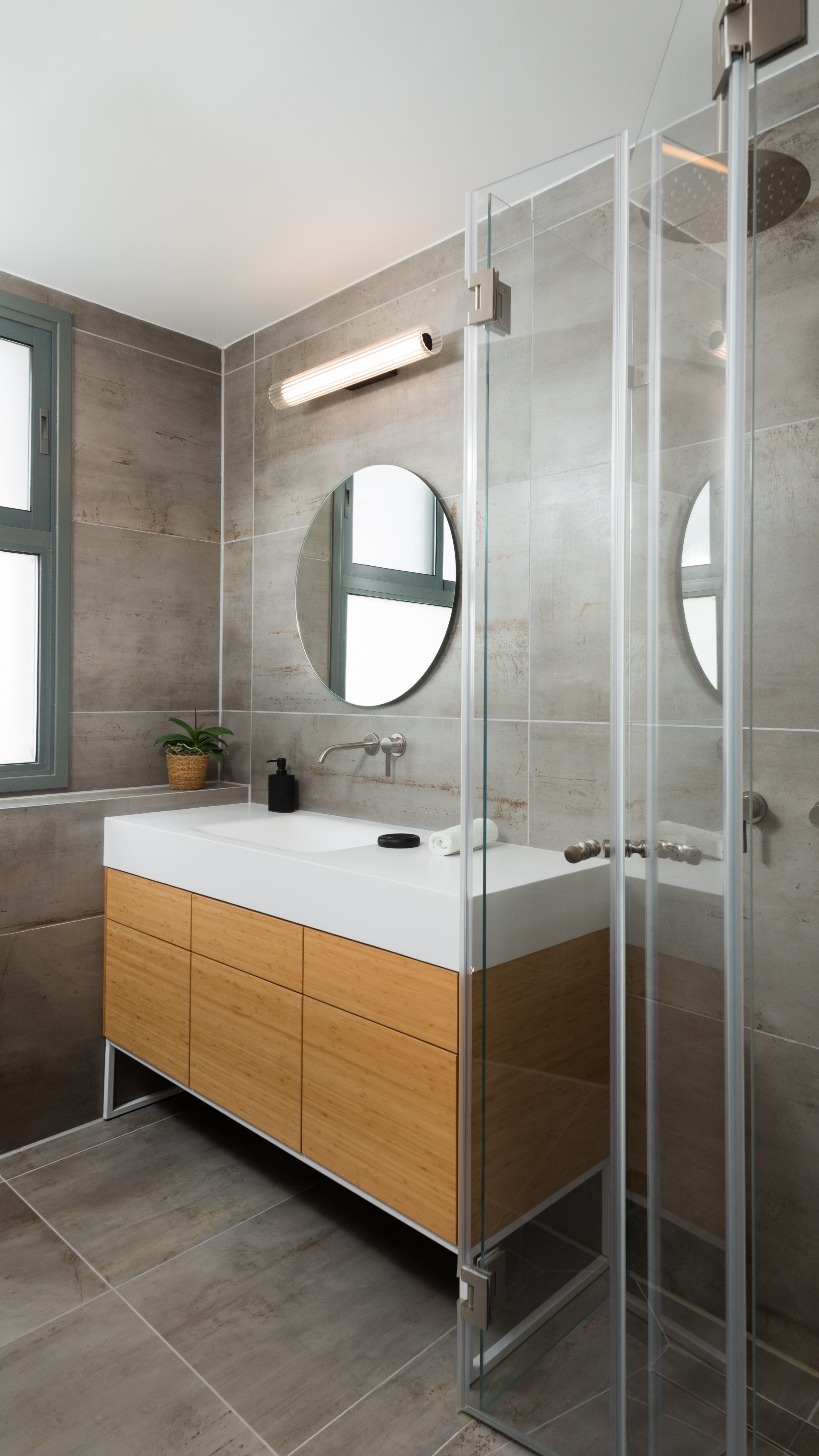 השפה האדריכלית הגיאומטרית ממשיכה גם אל חדרי הרחצה. ביחידת ההורים תוכנן ארון רחצה מרכזי, רחב ונוכח, המשלב את אותה טקסטורת ״קוביות״ שמלווה את הבית כולו. לחדר הרחצה השני נבחר ארון קטן יותר, המעוצב באותה השפה.