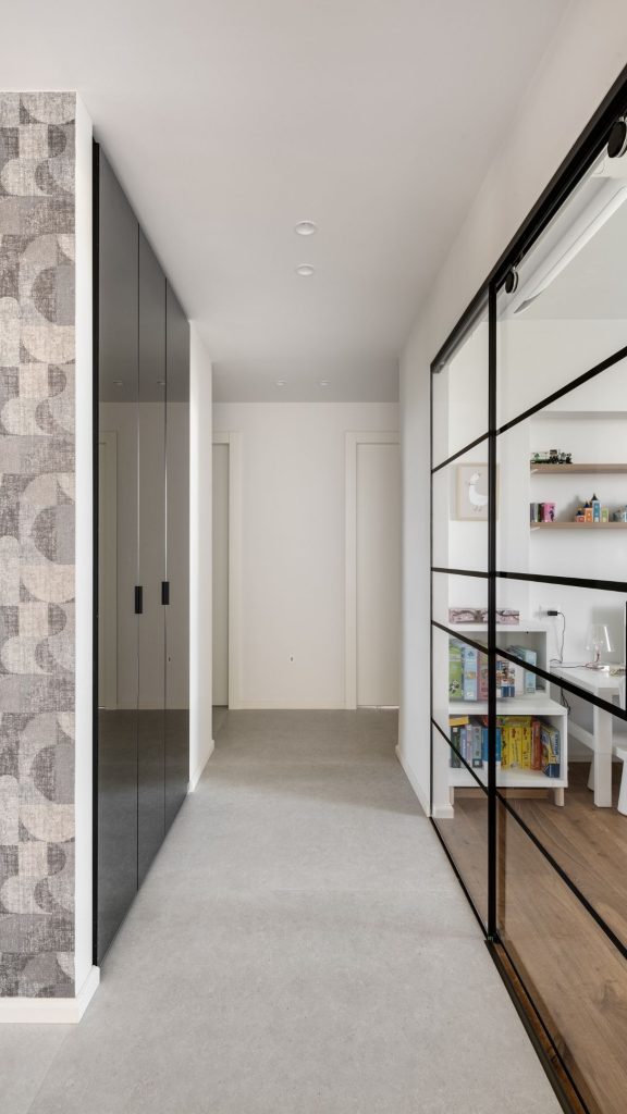 חללי המעבר זוכים לעיתים לפחות תשומת לב, אך בפרויקט זה גם המסדרון הפך לחלק מתהליך השיפוץ הכולל. לאורכו תוכננה חזית נגרות רציפה המסתירה ארונות תקשורת וחשמל. השילוב בין עץ, מתכת מחוררת וזכוכית מראה כהה בגוון גרפיט, יוצר שכבות של חומר וטקסטורה, תוך שמירה על חזית אחידה ושקטה. הפתרון מאפשר מענה טכני מלא, מבלי לוותר על שפה עיצובית נקייה ומדויקת.