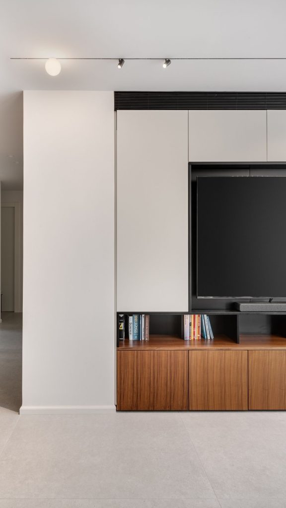 בלב הסלון תוכננה יחידת נגרות רחבה שעוטפת את הקיר המרכזי מקצה לקצה. זהו מהלך תכנוני שמאגד בתוכו אחסון נסתר, הסתרת מערכות מיזוג ומדפי תצוגה, מבלי לשבור את הקו הנקי של החלל. הבחירה בשילוב של עץ אגוז טבעי עם אפוקסי בגוון הקיר יצרה המשכיות חומרית רגועה. בצידה הימני של היחידה שולבו מדפי זכוכית עם תאורה פנימית, המוסיפים עומק ושכבה נוספת של עניין, מבלי להעמיס.
