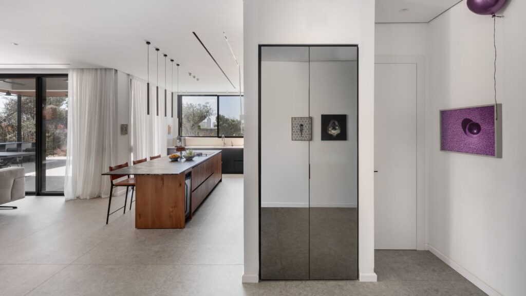 אחד החידושים היפים בפרויקט הוא ארון החשמל-תקשורת, שלרוב נחשב לאתגר עיצובי. כאן הוא הפך לנקודת חוזק: חזית במראה מושחרת, מסגרת מתכת מוקפדת וידית תואמת יוצרים פריט אלגנטי שמקבל את פני הנכנסים לבית. הוא משמש גם אלמנט תיחום בין אזור השירותים למטבח, וגם הצהרה עיצובית שקטה ומדויקת.